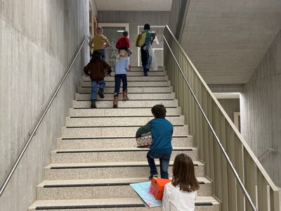 Besonders vorbildlich: Schon vor dem ersten Betreten der Klassenzimmer wurden gewissenhaft die Hausschuhe angezogen, damit die Schönheit des neuen Gebäudes möglichst lange erhalten bleibt. Nach einem kurzen „Probesitzen“ auf den neuen Stühlen und einem kleinen Rundgang durch die hellen, modernen Räume ging es zunächst wieder zurück in den Unterricht im Bestandsgebäude. 11 von 10 Punkten erteilten die Kinder ihren neuen Räumlichkeiten.