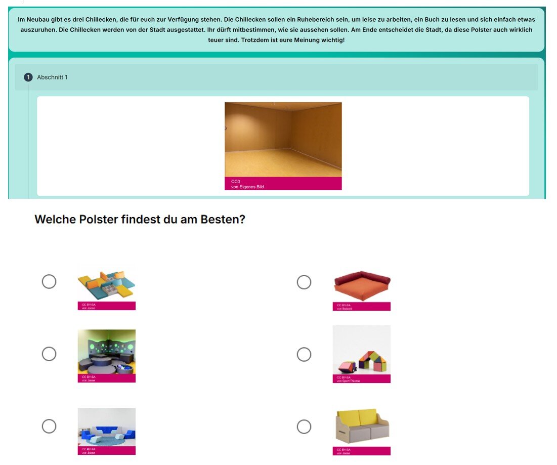 In jeder Lernzone gibt es eine sogenannte Chillecke, die zum Ausruhen, Abschalten, ruhigen Arbeiten, Lesen, Podcast hören oder für Flüstergespräche gedacht ist (siehe Foto). Der Schulträger möchte diese Bereiche möglichst bedarfsgerecht ausstatten und ermöglicht darum eine Mitbestimmung der Schülerinnen und Schüler, sowie den Lehrkräften. Diese Aufgabe stellten Frau Haiber und Frau Reina dem Schülerparlament vor. Gemeinsam diskutierten sie über Nutzen und mögliche Ausstattung mit Polstern und Sitzgelegenheiten. Schnell stellte sich heraus, wir müssen eine Umfrage in allen Klassen machen, um ein aussagekräftiges Stimmungsbild zu bekommen. In der darauffolgenden Woche wurde eine digitale Umfrage mit verschiedensten Polsterbeispielen erstellt und die Klassensprecherinnen und Klassensprecher stellten dieses Projekt in allen Klassen vor. Die Umfrage läuft bis Ende dieser Woche, dann werden die Ergebnisse für die Kinder veröffentlicht + mit der Bitte um Berücksichtigung an den Schulträger weitergegeben – Demokratieerziehung für Kinder erlebbar.