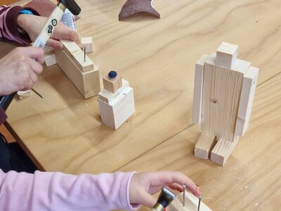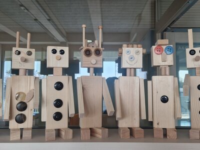 In der Klasse 2b beschäftigten wir uns im Sachunterricht mit verschiedenen Werkzeugen. Da wir eine tolle Werkstatt in der Schule haben, wollten wir diese im Rahmen dieser Einheit natürlich auch besuchen! Beim ersten Besuch verschafften wir uns einen Überblick, welche Werkzeuge vorhanden waren und wiederholten, was man damit machen kann. In der nächsten Kunst und Werken-Stunde durfte dann endlich mit Holz gearbeitet werden. In der Werkstatt standen Holzstücke in verschiedenen Größen bereit und schon bald wurde geplant, mit Schleifpapier geschliffen, mit dem Handbohrer Löcher gebohrt, bewegliche Arme und Knöpfe mit dem Hammer angenagelt und verleimt. So entstanden tolle Roboter, die im blauen Bereich unserer Schule bewundert werden können!