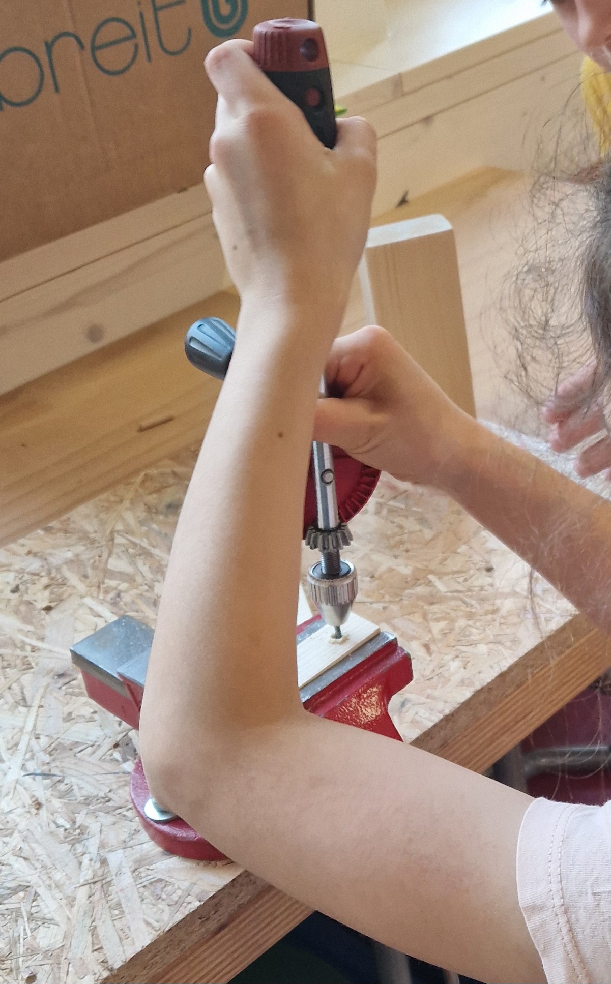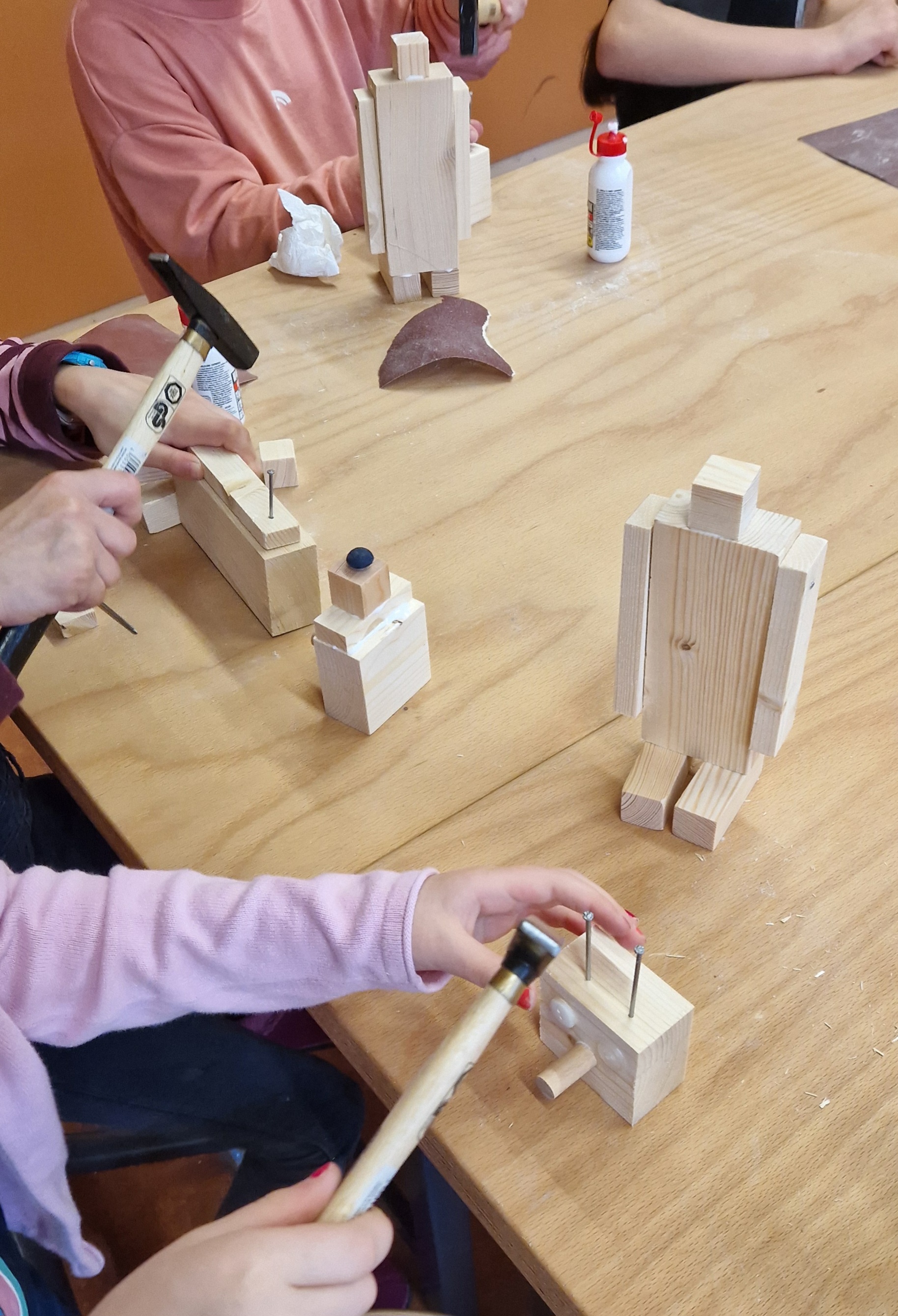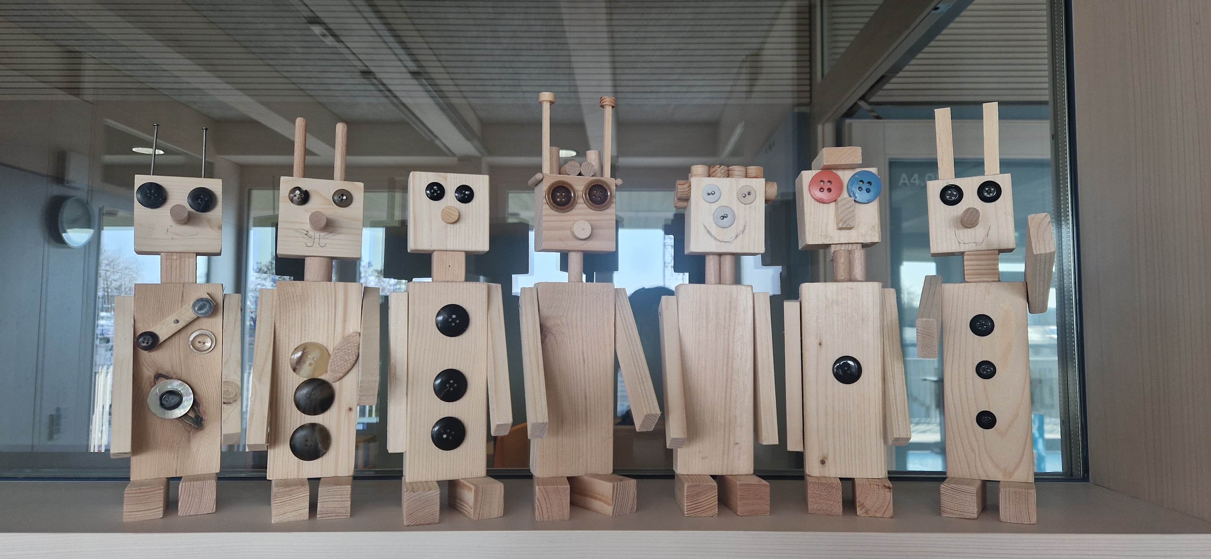 In der Klasse 2b beschäftigten wir uns im Sachunterricht mit verschiedenen Werkzeugen. Da wir eine tolle Werkstatt in der Schule haben, wollten wir diese im Rahmen dieser Einheit natürlich auch besuchen! Beim ersten Besuch verschafften wir uns einen Überblick, welche Werkzeuge vorhanden waren und wiederholten, was man damit machen kann. In der nächsten Kunst und Werken-Stunde durfte dann endlich mit Holz gearbeitet werden. In der Werkstatt standen Holzstücke in verschiedenen Größen bereit und schon bald wurde geplant, mit Schleifpapier geschliffen, mit dem Handbohrer Löcher gebohrt, bewegliche Arme und Knöpfe mit dem Hammer angenagelt und verleimt. So entstanden tolle Roboter, die im blauen Bereich unserer Schule bewundert werden können!